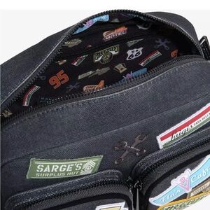 Covered with patches of the shops in Radiator Springs, the front of this bag includes two zippered pockets and embroidered tool details. With a Route 66 patch on the back and an adjustable strap, this bag is perfect for wearing multiple ways.