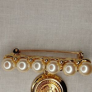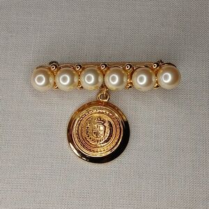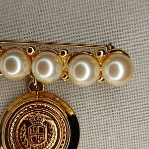Vintage Liz Claiborne Pearl Bar Brooch Gold Medallion Crest Charm