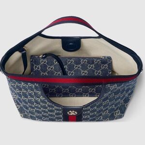 Cute small tote with GG design on blue denim and iconic stripe. Includes leather shoulder strap.