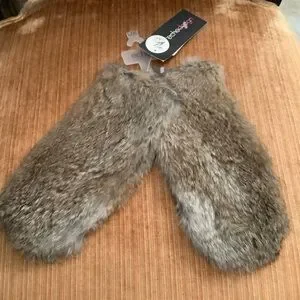 These are women's XL mittens from the brand ECHO, made of leather and rabbit fur in a taupe nude color. They have aloe trim and are lined with polyester, featuring a fingerless design and wrist length. Suitable for various occasions like travel, parties, formal events, and business settings, these gloves are ideal for winter walking.