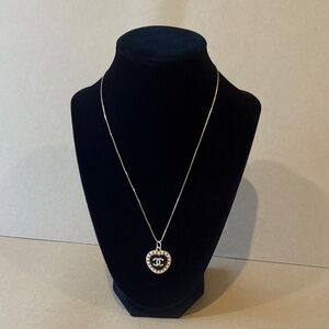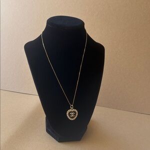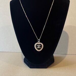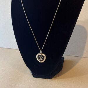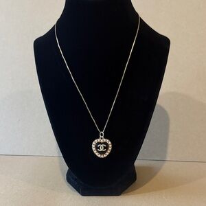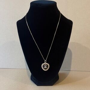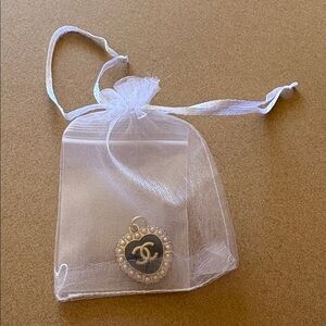 Heart shaped CC pendant in black with gold tone hardware and pearl like trim