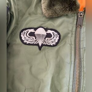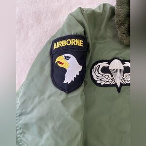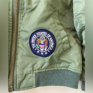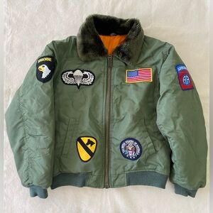 Super rad vintage Military surplus B-15 Youth Jacket, covered in various US related patches. In overall good vintage condition with lots of life left. No holes or major staining.