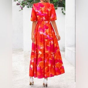Step out in style with this vibrant floral maxi dress. Featuring a stunning blend of red, pink, and orange hues, this dress is perfect for any occasion. The elegant design and bold colors make it a must-have addition to your wardrobe.