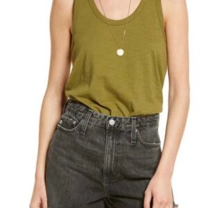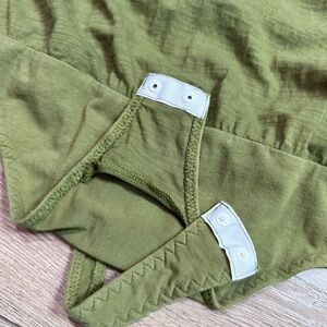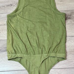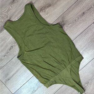Scoop neck tank bodysuit from Intimately Free People. Olive sparrow in color (olive green). Loose fitting to give that blouse-y look. Double snap closure. Thong back. Made of cotton, gusset made of cotton & spandex.
