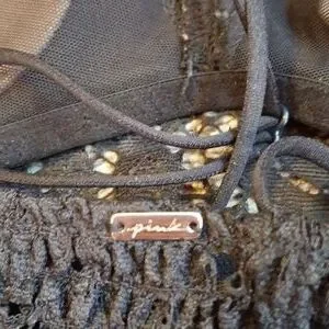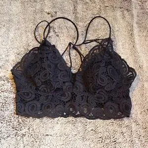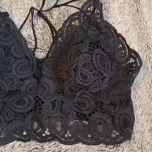 Chic black lace bralette with delicate detailing. Ideal for stylish layering. Very sexy piece! Worn once by my daughter under a see thru top and it was adorable! She cut the tag out but the PINK name plate is still on the scrunched back. All the straps are adjustable for the perfect fit. The size is medium I do believe!