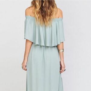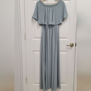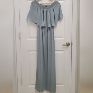 Step out in style with this elegant off-shoulder maxi dress. Perfect for any occasion, this light sage green dress offers a chic and comfortable fit. Elevate your wardrobe with this timeless piece.