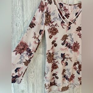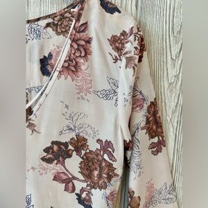 Lightweight, flowy and boho for summertime. Perfect for weddings or travel. Light blush pink with floral design. Soft bell sleeves and a side zip to help get in and out.
