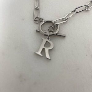 Elegant silver necklace featuring an initial pendant. Perfect for adding a personal touch to any outfit.