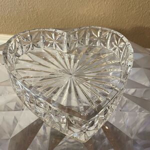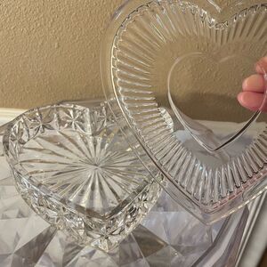 Really beautiful! Large glass heart shaped trinket box with lid. No chips or cracks! Substantial not lightweight. Clean home 7x7!
