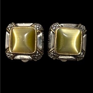 This is a pair of vintage square green cat's eye clip-on earrings in silver tone. Very good vintage condition. The hallmark has worn off but I believe they were once ding W. Germany. Approximately one inch each.