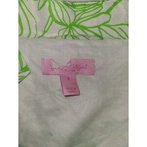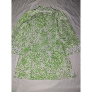 Brighten your wardrobe with this vibrant Lilly Pulitzer tunic top, a true embodiment of effortless summer style. Adorned with a cheerful green floral print and striking white embellishments around the neckline and cuffs, this piece promises to turn heads. The playful design and flattering silhouette make it perfect for a beachside brunch, a casual day out with friends, or a relaxed evening gathering.