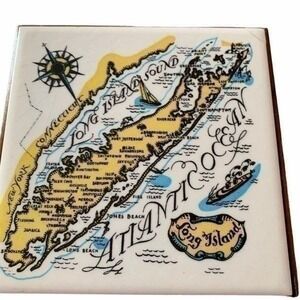Vintage Mid- Century Modern Ceramic Trivet in Excellent Condition with no signs of wear, wood is aged in a manner consistent of a vintage piece of decor. Made in Pilkington in England, pictured on trivet is the Long Island Sound and the many towns around it. 6-1/4 by 6-1/4 inches trivet, handle extends to 10".