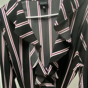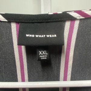 This gorgeous Who What Wear Ruffle Neck Wrap dress is ready for work or play. It is a wrap dress and can be adjusted for your style & comfort. It is black with white & dark pink/maroon stripes. It is size XXL