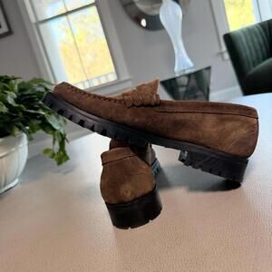 J. Crew Brown suede penny loafers featuring a durable black lug sole for added traction.