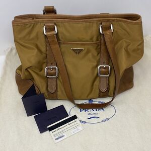 In excellent preowned condition authentic large capacity PRADA tote bag, in gorgeous tan/brown nylon with genuine leather trim and dual leather straps. Minor signs of wear to exterior leather but hardly noticeable. Interior is super clean. Comes with original dust bag and authenticity documents.