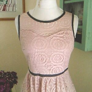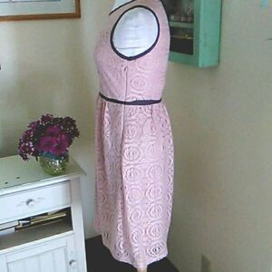 Soft dusty pink. Lacy fabric with taupe trim . Side zip. Keyhole back. Fully lined below the sweetheart front. Size 6 measures 36 at chest, 28 at waist, 42 at hips. 39 long from shoulder to hem. Such a pretty dress.