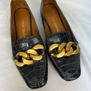 Tory Burch Black Croc Loafers with Gold Chain Accent