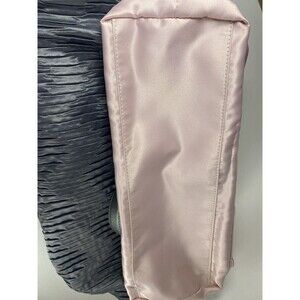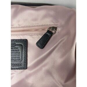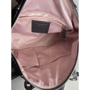 Interior is lined in light pink satin with zip and slip pockets. Zip-top closure with Coach logo on front.