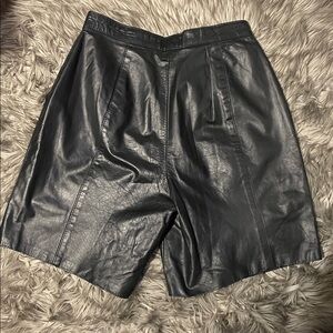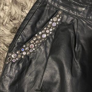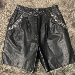 Stylish black leather shorts with sparkling embellishments. Perfect for a chic and edgy look. Waste measurements 15 inches length 19 inches.