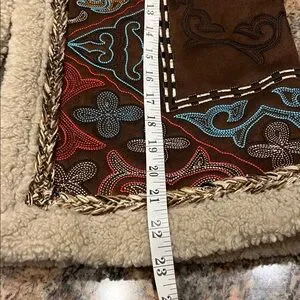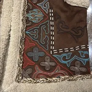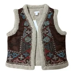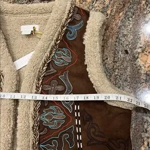 House of Harlow 1960 Embroidered Sherpa Trim Vest in brown faux suede and cream faux shearling. This is a beautiful vest great for fall or winter. The colors are multi brown blue orange beige one size fit all would look great with skirts. Jeans pants great for the holidays. Same day shipping. Smoke-free home.
