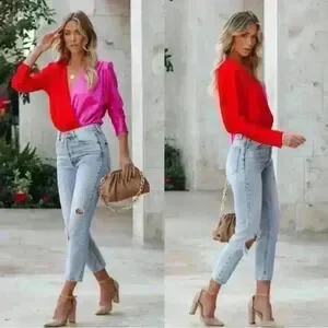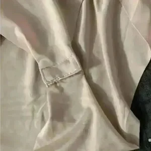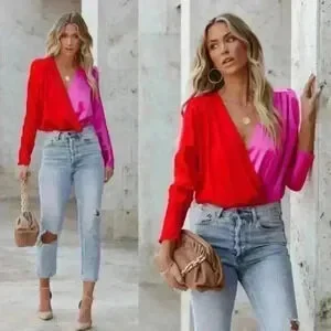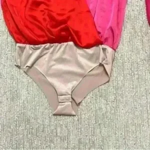 This long sleeve satin bodysuit has a surplice neckline, slight shoulder padding and a clasp at the bust you can close for modesty or open for showing off that cleavage. The bodysuit has long cuffed sleeves, a double clasp at the bottom and an elasticized waist.