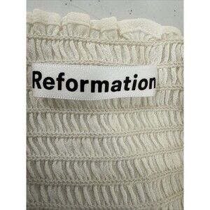 The Reformation Dress Womens 16 Ivory Nikita is a stylish and elegant dress perfect for various occasions such as parties, weddings, and formal events. This dress features a sweetheart neckline, tie closure, and smocked accents, giving it a unique and charming look. Made of knit fabric with a midi length and sleeveless design, it offers a flattering fit and flare style. The ivory color and strappy sleeves add a touch of sophistication, making it a timeless piece for any wardrobe.