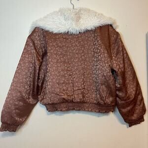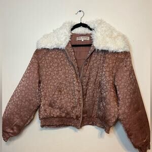 NWOT-Free People Crafted Floral Bomber Jacket Peach zip up with fur collar Sz:SM