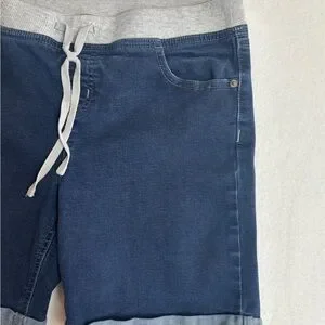 • Soft denim with a gray ribbed knit waistband and drawstring tie