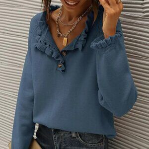 BTFBM Women's Sweaters Fall Winter Clothes 2026 Long Sleeve Button Down Ruffle Crew Neck Casual Knitted Pullover Tops - DARK BLUE