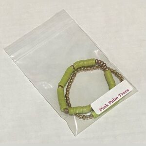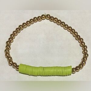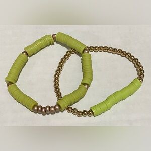 Green/Gold Clay Heishi Disc Beaded Bracelet Set (2) Boho Classic Coastal Preppy