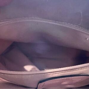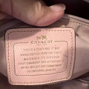 Chic Coach satchel with floral pink design. Black accents add elegance. Ideal for any occasion. Scratch on back see photo.