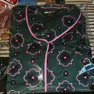 Stylish green pajama set with pink accents. Features a geometric pattern. NWOT