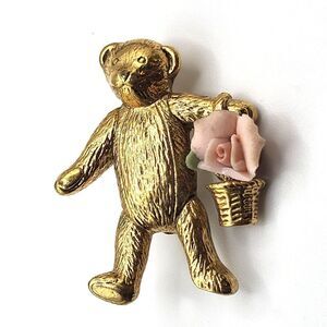 Vintage Gold Tone Teddy Bear Brooch With Porcelain Rose Basket Detail 1.5in | Materials: gold metal alloy, porcelain | Length: 1.5in | Clasp: brooch pin | Signed? no | Excellent vintage condition