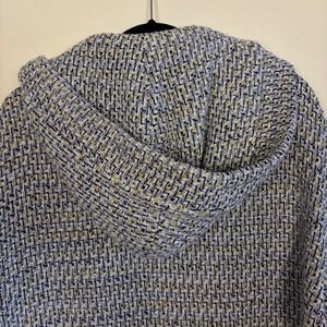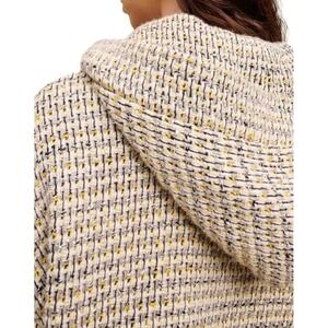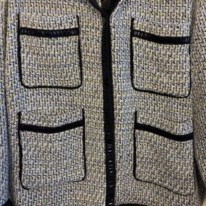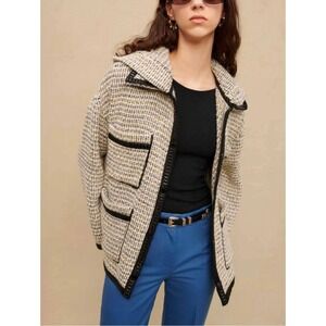 Elegant tweed blazer by Maje. Features black trim and cream base. Stylish and versatile.