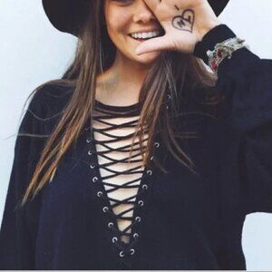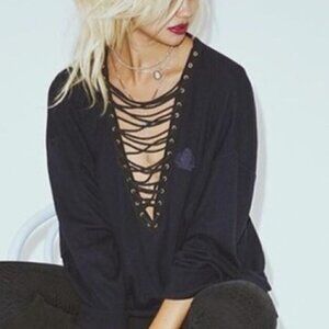 Brand took a classic 1970's "The Fox" sweater that was sold at J.C. Penney and transformed it into this super sexy pullover with lace up front detail for women. Has the classic "The Fox" patch on chest. Drawstring ends are inside so you can adjust as needed.