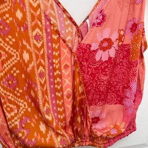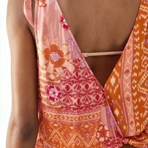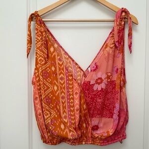 Free People Tied To You Tank in Lemonade Combo. This surplice wrap-style top features a contrasting floral pattern and tie-sleeves, a plunging v-neckline, cinch elasticized waist, and v-cut low back.
