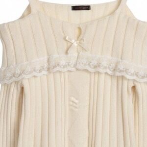 Cream ribbed knit sweater with off-the-shoulder design. Delicate white lace trim adorns the neckline and cuffs. Features thin spaghetti straps and a small decorative bow at the center front. A charming piece perfect for a romantic brunch or a cozy evening out.
