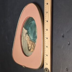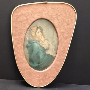Unique vintage rare MCM framed art piece featuring a mother and baby. Set in a pink with gold metal frame.