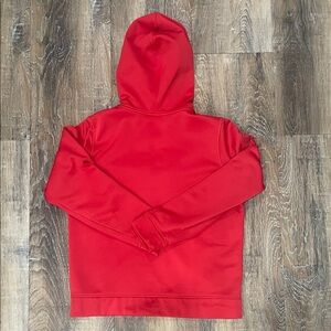 Vibrant red hoodie with full zip. Features Under Armour logo on chest and sleeve. Comfortable and stylish for kids.