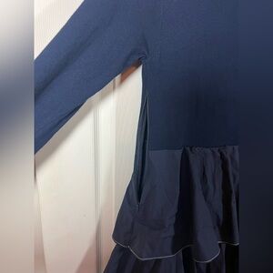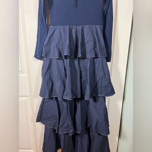 Stylish navy blue tiered maxi dress with long sleeves, reminiscent of the Thea from Anthropologie with a tiered skirt.