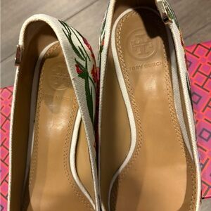These gorgeous Tory Burch cream embroidered floral heels / pump is in excellent condition. Worn twice if that!