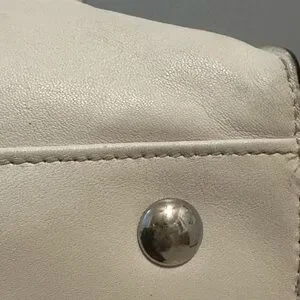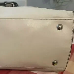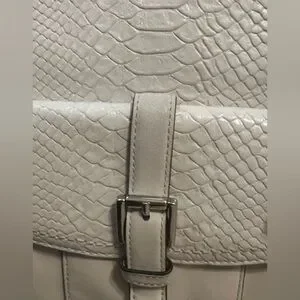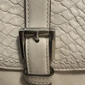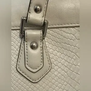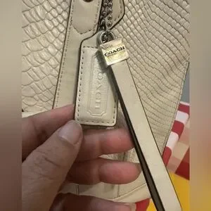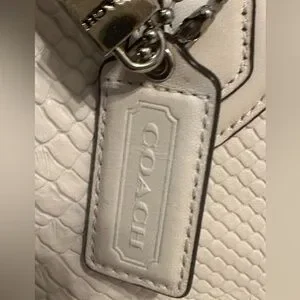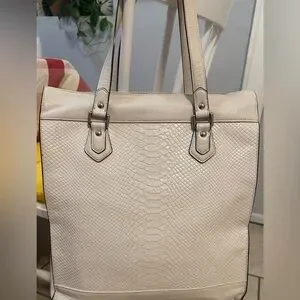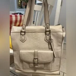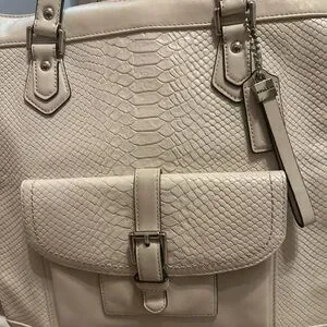 Chic, rare, limited edition Coach tote F28723 with embossed python leather. Roomy bag features double handles, magnetic front flap with buckle, secure D-ring top closure, beige fabric lining, interior pockets, silver-tone hardware, and metal feet. Includes Coach tag and keyholder. In great condition; see photo for light mark on bottom. Color Chalk (off-white). 13x12x6