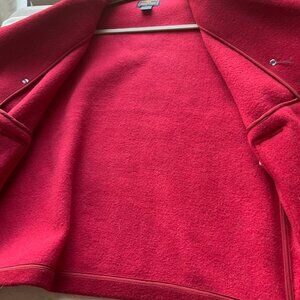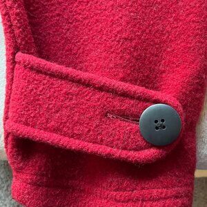 Woolrich womens Sz Medium Pea coat wool blend Ruby Red Double breasted , material 84 % wool and Nylon, color Ruby Red, good used condition just buttons are a bit loose and one button has a light scratch (easy fix) light peeling see photos 7 and 8, front pockets, inside fleece, not lined ,