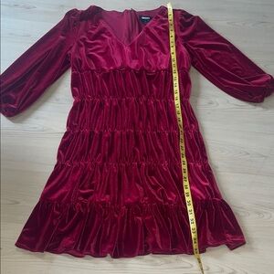 Luxurious velvet dress in a deep red hue. Features a flattering V-neckline and gathered waist.