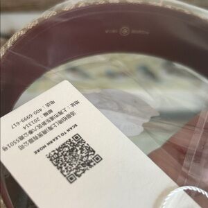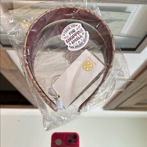 Elegant Tory Burch headband with intricate tan pattern. Ideal accessory for chic style.