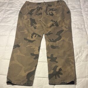 Joe's Jeans camouflage trousers, specifically a straight or relaxed leg fit style. They feature a muted, earthy green and brown camouflage pattern. Meant to slouch low on hips and have a baggie look 2 front pockets 2 front zipper fake pockets 2 fake back pockets