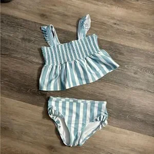 Stylish blue and white striped swimsuit set. Features a smocked top with ruffle straps and matching bottoms.