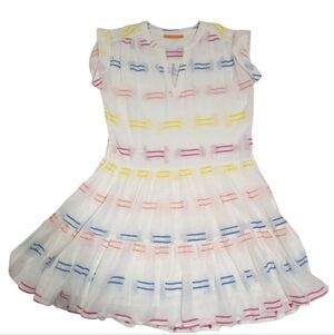 Bright, breezy, and beautifully feminine, this Oliphant midi dress features a soft white base with colorful rainbow stripe detailing throughout. Designed with a flattering V-neckline, cap sleeves, and a gently cinched waist that flows into a tiered midi skirt. Lightweight and airy—perfect for spring, summer, vacations, brunch, or resort wear.