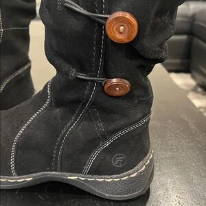 Stay warm with these stylish black boots. Features cozy lining and brown button details. Perfect for winter wear.