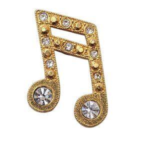 This gold-tone lapel pin is designed in the shape of a stylized musical note, accented with clear rhinestones set along the note stem and heads. The front features a mix of round rhinestone settings and textured gold-tone metal, giving the piece visual depth and sparkle while maintaining a structured, graphic form. The reverse shows a post-and-clutch style fastener commonly used for lapel pins and small decorative insignia. Musical note jewelry has long been used as a decorative motif in costume jewelry, particularly in mid- to late-20th-century designs associated with music appreciation, performance culture, and novelty accessories. The combination of gold tone and rhinestone detailing gives this piece a classic stage-inspired look suited to display or collection.